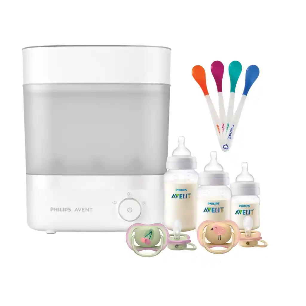En Alma estamos de Aniversario ¡Aprovecha de todas nuestras promociones! www.almaenlinea.cl Pack Avent Esterilizador Eléctrico - 3 Mamaderas - 4 Cucharas - 2 Chupetes Contenido: 1 Esterilizador eléctrico a vapor Avent bebé y adulto Set 3 mamaderas anti-colic 125 ML+260ML+330 ML 4 Cucharas con sensor de temperatura Munchkin 2 Chupetes Ultra Air 0-6m ESTERILIZADOR Y SECADOR ELECTRICO PREMIUM Esterilice, seque y almacene. El potente vapor esteriliza y el aire filtrado se seca. Prepárese para la próxima toma del bebé en 40 minutos. El esterilizador y secador de biberones Premium utiliza chorros de aire filtrado para secar los biberones antes de apagarse. El esterilizador elimina el 99,9 % de los gérmenes*, a fin de que esté tranquilo en cada toma. Fácil de limpiar y de armar Bandeja para goteo integrada Elimina el 99,9 % de los gérmenes* Sterilize and dry in 40 mins Diseño que ahorra espacio SET DE MAMADERAS ANTICOLICOS Clínicamente comprobado que reducen los cólicos y los malestares.* Este set incluye 3 mamaderas anticólicos de 125 ml con tetina de flujo para recién nacido, de 260 ml con tetina de flujo medio y de 330 ml con tetina de flujo rápido Con válvula anticólicos diseñada para mantener el aire lejos de la pancita del bebé para reducir el malestar 60% menos malestar durante la noche* Tetina con textura acanalada que evita la contracción permitiendo una alimentación ininterrumpida Antigoteo para una alimentación agradable Cuello ancho y menos piezas para facilitar la limpieza y el montaje Forma ergonómica para sujetar fácilmente 0% BPA Compatible con toda la gama Philips Avent y con las tetinas de diferentes niveles de flujo Origen: Brasil. * Los bebés de dos semanas alimentados con mamaderas Philips Avent presentaron menos cólicos y una reducción significativa de la irritabilidad durante la noche, que aquellos alimentados con mamaderas de otras marcas. SET 2 CHUPETES ULTRA AIR 0-6 m Un chupete liviano que favorece la respiración Los orif. de vent. de gran tamaño permiten que la piel del bebé respire Tranquilice a su bebé con un chupete que permite que su piel respire. La colección ultra air de Philips Avent tiene orificios de gran tamaño para mantener la piel seca. Su cubierta liviana está diseñada para un flujo máximo de aire. Está disponible en varios colores y diseños. Mantiene la piel del bebé suave y seca Deja que la piel respire Esterilícelo y guárdelo en una práctica funda Esterilice y almacene en un estuche práctico Tetina de textura sedosa que ofrece la máxima comodidad Amado por bebés en todo el mundo. La textura ideal para una sensación de comodidad Respeta la forma natural del paladar, los dientes y las encías Fashionable colors and designs Colores y diseños modernos 4 CUCHARAS CON SENSOR DE TEMPERATURA Sistema patentado de detección de calor: punta de cuchara se vuelve blanca cuando la comida del bebé es demasiado caliente (aproximadamente 110 F y más. Tazón de cuchara estrecha es cómodo para bocas pequeñas, y puntas blandas son suaves en las encías. Mangos largos para una mejor alimentación en sillas altas. Sin BPA ni ftalatos apto para colocarlo en la charola superior del lavaplatos.