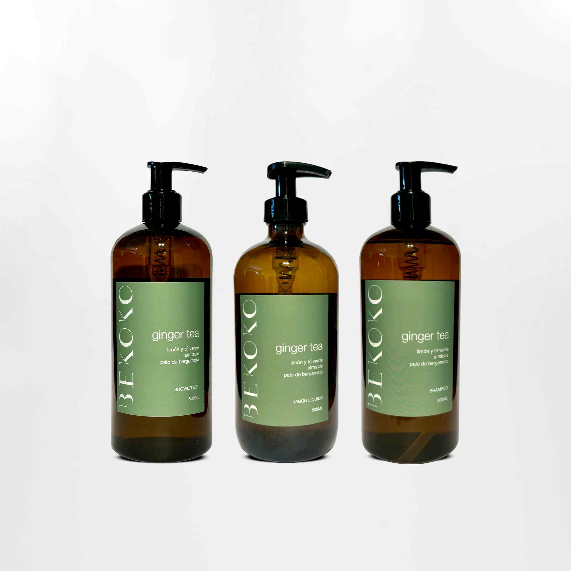<p>Pack Ginger Tea: Shampoo + Jabón Líquido + Shower Gel Sumérgete en una experiencia de bienestar y frescura con el Pack Ginger Tea, una combinación perfecta para el cuidado de tu piel y cabello. Este set incluye tres productos esenciales con la cálida y revitalizante fragancia de Ginger Tea, que equilibra notas energizantes de jengibre con la sutil frescura del té. Incluye: ✔ Shampoo Ginger Tea (500 ml) – Envase PET ✔ Jabón Líquido Ginger Tea (500 ml) – Envase de vidrio ✔ Shower Gel Ginger Tea (500 ml) – Envase PET Beneficios: Limpieza profunda y suave: Fórmulas diseñadas para eliminar impurezas sin resecar, ni dañar la piel ó el cabello. Hidratación y nutrición: Ingredientes que protegen y revitalizan. Fragancia envolvente: El jengibre energiza mientras que las notas de té brindan equilibrio y calma. Libre de químicos agresivos: Sin sulfatos, parabenos ni siliconas. Sustentabilidad: El Jabón Líquido viene en un envase de vidrio reutilizable, mientras que el Shampoo y el Shower Gel están en envases PET reciclables. 100% Cruelty-Free Este pack es ideal para quienes buscan una rutina de cuidado completa con ingredientes naturales y una fragancia exquisita. ¡Disfruta del ritual perfecto para tu piel y cabello con el aroma revitalizante de Ginger Tea!</p>