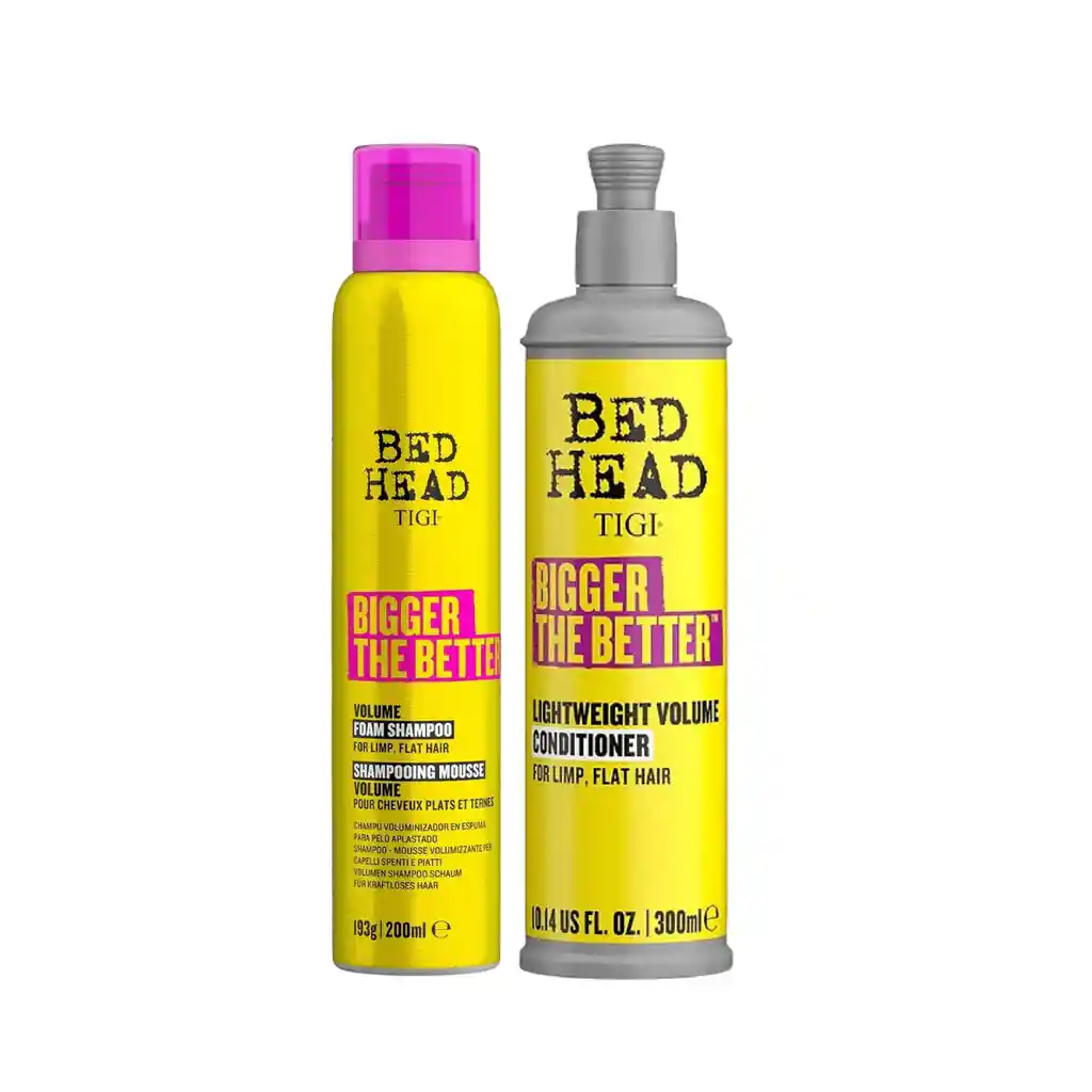 El Pack Bigger The Better de Bed Head by Tigi fue creado para dar volumen visible al cabello fino o sin cuerpo, sin comprometer suavidad ni ligereza. Incluye un shampoo en espuma con tecnología voluminizadora y un acondicionador liviano que hidrata y desenreda sin aplastar la fibra capilar. El shampoo, con su textura mousse, limpia profundamente sin resecar ni dejar residuos pesados. El acondicionador aporta la hidratación justa para mantener el movimiento natural, controlar el frizz y dejar el cabello con cuerpo y brillo saludable. Ideal para quienes buscan volumen duradero con una sensación de cabello limpio, suelto y manejable desde la raíz. Cantidad: Shampoo 200 ml y Acondicionador 300 ml.