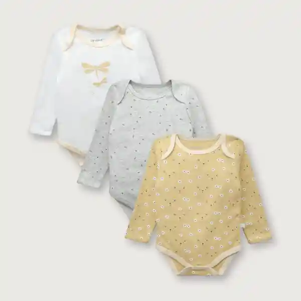 Pack Opaline Contiene 3 Unidades. En Tonos Mostaza Blanco y Gris 2 Con Full Estampado de Flores y Uno Con Estampado Central de Libélula Super Suaves y Elasticados 100% Algodón. Broches en Entrepiernas y Cuello Americano Para Una Fácil Postura.