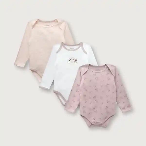 Pack Opaline Contiene 3 Unidades. Bodys 100% Algodón Calidad Super Suave y Elástica. Con Tiernos Estampados de Minnie en Color Morado Opaco Blanco y Rosa Claro.