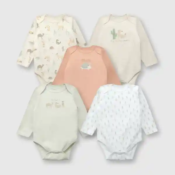 Pack Colloky Contiene 5 Unidades. Body Manga Larga 5 Und. Para Niño. De Algodón Suavizado Con Broches Inoxidables en la Entrepierna. Hombro Cruzado Para Fácil Postura.