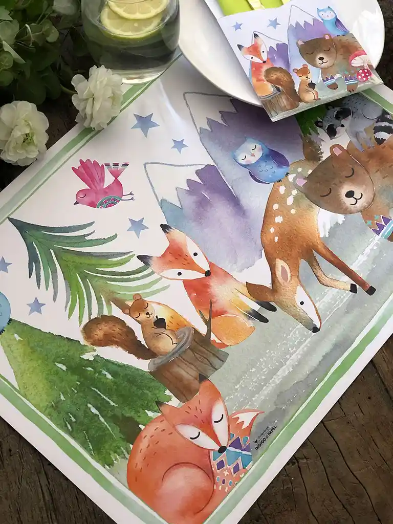 Pack de Cumpleaños Bosque para 6 6 Individuales, papel bond blanco 140g. Formato 32x44cm 6 Estuches de Papel armables 6 Servilletas verde