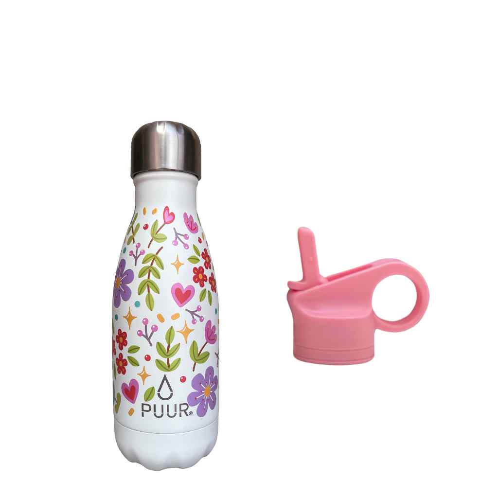 <p>Puur Bottle Floral, la botella t&eacute;rmica llena de peque&ntilde;as flores de colores, equipada con tecnolog&iacute;a de triple capa, ideal para acompa&ntilde;arte y mantener tus bebidas a la temperatura perfecta a lo largo del d&iacute;a.Construida con una s&oacute;lida doble pared de acero inoxidable 304 y una capa adicional de cobre, esta botella asegura una retenci&oacute;n excepcional de la temperatura, manteniendo tus bebidas fr&iacute;as durante 24 horas y calientes durante 12 horas. Este pack viene con una tapa rosca con bombilla de color rosado que te permitir&aacute; beber con facilidad y sin preocupaciones de derrames.</p>