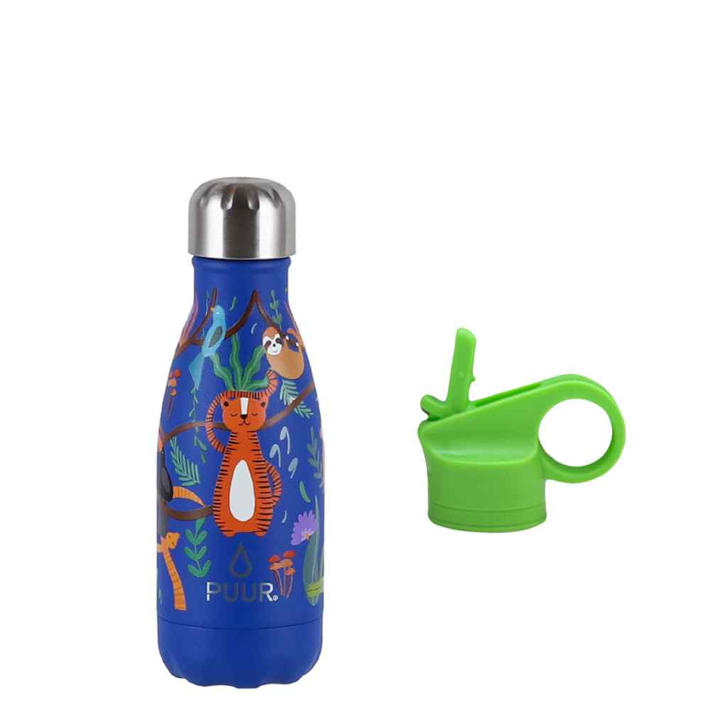<p>Descubre la Puur Bottle Jungle, una botella térmica de color azul y encantadores diseños de animales selváticos, perfecta para acompañarte y mantener tus bebidas frescas o calientes durante todo el día.Construida con la misma calidad que caracteriza a nuestras botellas, cuenta con una sólida doble pared de acero inoxidable 304 y una capa adicional de cobre para garantizar una retención excepcional de la temperatura. Disfruta de tus bebidas frías durante 24 horas y calientes durante 12 horas, conservando su sabor y frescura sin igual.Este pack incluye una tapa rosca con bombilla de color verde, equipada con una bombilla que te permite beber con facilidad y sin preocupaciones de derrames.</p>