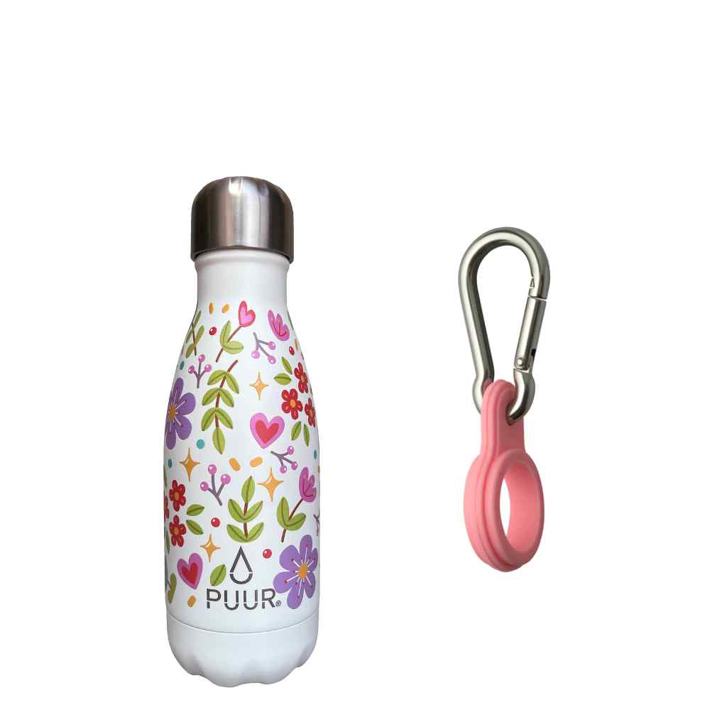 <p>Nuestro pack de botella térmica Floral de 260 ml y el Hook Pink para transportarla es ideal: la botella está llena de flores de múltiples colores, es 100% hermética, evitando derrames. Gracias a su tecnología de triple pared, con doble capa de acero inoxidable 304 más una película de cobre, conserva la temperatura de las bebidas hasta 24 horas frías y 12 horas calientes. Libre de BPA y reutilizable, esta botella es práctica y funcional. Su gancho fabricado en acero inoxidable y argolla de silicona color rosa se coloca alrededor del cuello de la botella. Descripción: Botella térmica de doble pared de acero inoxidable 304 (grado alimento) que mantiene la temperatura de los líquidos hasta 24 horas fríos y 12 horas calientes. Libres de BPA.Gancho con anillo de silicona de alta resistencia y está diseñado para llevar tu botella a todos lados de manera fácil.Dimensiones -Botella: 20.5 cm de alto x 6 cm de diámetro-Gancho: Largo total 10 cm. Diámetro interior del anillo de silicona 2,5cm. Solo puede ser utilizado para Puur Bottle de boca angosta y de 260 a 500 ml .-Peso Total Pack: 320 gr. Aproximadamente.Lavar con agua tibia y lavaloza, secar destapada. Precaución: no sobre rellenar la botella con líquidos calientes, podría causar quemaduras al abrirla.</p>