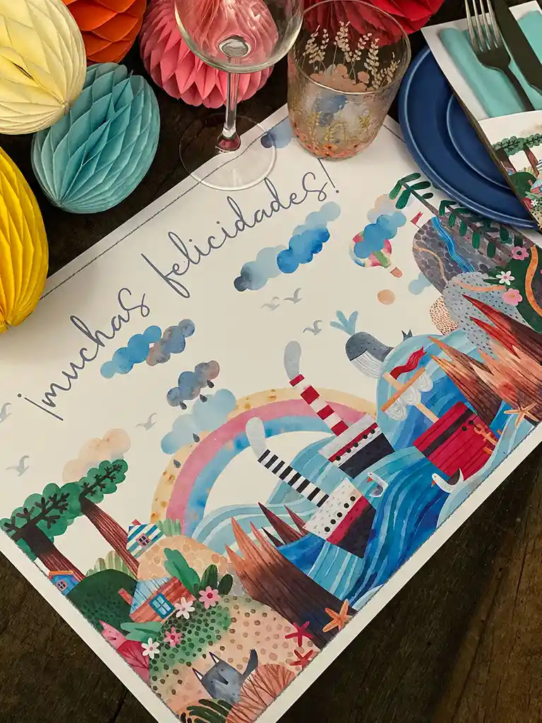Pack de Cumpleaños Buque para 6 personas 6 Individuales, papel bond blanco 140g. Formato 32x44cm 6 Estuches de papel armables 6 Servilletas celeste 20 x 20 cm
