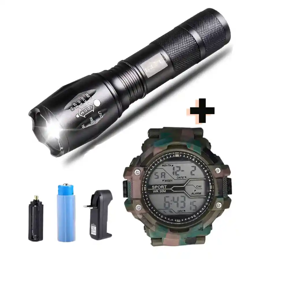 Caja Linterna - Accesorios linterna tactica metalica recargable 3 modos de iluminacion Alta. baja e intermitente incluye todo lo de la fotografia; Linterna . Pila. Cargador. Soporte y caja de transporte. Reloj camuflaje Visualización de día y fecha: Puede saber claramente la fecha diaria de que sólo necesita pulsar el botón. • Función de alarma: Cuando está activada, puede ser despertada o recordada en cualquier momento que desee. • Cronómetro: Sin un temporizador, también puede contar el tiempo. • Con luz de fondo, se puede ver el tiempo claramente en el lugar oscuro. • 3ATM resistencia al agua es conveniente para su vida diaria, cuando se lava las manos, lavar la cara, no es necesario quitar el reloj. • La correa de goma es suave y suave al desgaste. _______________ ENVÍOS A TODAS LAS COMUNAS Y REGIONES DE CHILE