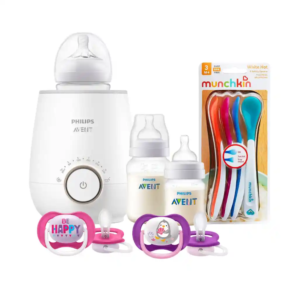 Contenido: 1 Calentador eléctrico de mamaderas 1 Pack de mamaderas Anti Colic 125ml, 260ml más tetina 6+ meses 1 Pack de 4 cucharas térmicas 2 Chupetes 6-18 meses Calentador de Mamaderas Premium Avent Este práctico calentador de mamaderas incluye un control de temperatura inteligente que evita que la leche y la comida de tu bebé se recalienten. Además, podrás ajustar el patrón de calentamiento para lograr un calentamiento rápido. Este calienta biberones mantiene la temperatura perfecta hasta 60 minutos, por si acaso necesita más flexibilidad a la hora de la comida, ¡y se adapta al biberón favorito de tu bebé! Características: Fácil de limpiar Calienta leche en tan solo 3 minutos* Gestiona la temperatura por usted, Ajuste el volumen, pulse el botón de Inicio y deje que el control de temperatura inteligente se ocupe del resto. Detecta la temperatura inicial de la leche, se calienta rápidamente a la tempera Descongela fácilmente, El calienta biberones descongela rápidamente leche y recipientes de comida para bebés. Ayuda con la transición a los alimentos sólidos, cuando el bebé está listo para pasar a los alimentos sólidos, el calienta biberones también sirve para descongelar recipientes de comida para bebés Menos tiempo en la cocina, Su diseño de una sola pieza permite una fácil limpieza para que pueda disfrutar de más tiempo con su pequeño. Listo en cualquier lugar, Nuestro calienta biberones mantiene la temperatura perfecta hasta 60 minutos, por si acaso necesita más flexibilidad a la hora de la comida Se adapta al biberón favorito de su bebé diseñado para adaptarse a los biberones Philips Avent favoritos de su bebé y a la mayoría de marcas líderes de biberones y recipientes de comida para bebés. Set Avent Biberón anti colic casa y paseo 125 y 260 con tetina 6m+ Set de 3 piezas: 1 Biberón de cuello ancho 125ml/4oz 1 Biberon de cuello ancho 260 ml/ 9oz 1 Tetina Anti-Colic 6+ Flujo rapido Diseñado para una alimentación ininterrumpida Otros beneficios Rango compatible desde la lactancia materna hasta el uso del vaso Tetinas con diferentes niveles de flujo disponibles Este biberón no contiene BPA Clínicamente comprobado, aminora los cólicos y los malestares* Válvula anticólicos demostrada que disminuye los cólicos* 60 % menos malestar durante la noche* Diseño con forma de tetina para una sujeción segura La textura acanalada evita la contracción para permitir una alimentación ininterrumpida Fácil de usar, limpiar y armar Diseño antigoteo Fácil de limpiar y armar con menos piezas Biberón de cuello ancho con borde redondeado para facilitar la limpieza Fácil de manejar SET DE 4 CUCHARAS C/SENSOR DE TEMPERATURA Estas prácticas cucharas tienen una punta blanda y suave, la que tiene el tamaño perfecto para la boca de tu bebé. ¡Así podrá alimentarse sin incomodidades y de forma mucho más amigable!. Además, ¡te ayuda a darle la comida a tu bebé en la temperatura ideal!. Características: Innovadoras cucharas de seguridad white Hot® que ayudaran en las primeras comidas, detectando la temperatura. Prácticas cucharas de puntas blandas y suaves, las que tienen un tamaño perfecto para la boca de tu bebé. La punta de la cuchara se torna blanca cuando la comida está muy caliente, aproximadamente a los 43°c o mas Mangos largos para alimentar de forma cómoda a tu bebé Material suave para las encías Libres de BPA y fosfatos No apto para microondas. Apto para lavavajillas Edad recomendada: 3 meses + Medidas: 17x2x2cm Este producto no es un juguete. Utilice siempre bajo la supervisión de un adulto Un chupete liviano que favorece la respiración Los orif. de vent. de gran tamaño permiten que la piel del bebé respire · Permite que la piel de su bebé respire · 6 a 18 meses · Anatómicos y sin BPA · Paquete de 2 Deja que la piel respire Los orificios de aire extra grandes ventilan suavemente la piel del bebé y la mantienen suave y seca. Colores y diseños modernos La colección ultra air siempre está a la moda. Sus diseños brillantes y coloridos le permiten a usted y a su bebé divertirse probando los estilos más recientes. La textura ideal para una sensación de comodidad. Preguntamos a las mamás cómo respondían sus pequeños a nuestras tetinas de silicona texturizada, y, en promedio, un 98 % afirmó que su bebé acepta los chupetes ultra soft y ultra air de Philips Avent. Respeta la forma natural del paladar, los dientes y las encías Cuida el desarrollo bucal de tu pequeño con una tetina simétrica que respeta la forma natural del paladar, los dientes y las encías. Esterilice y almacene en un estuche práctico