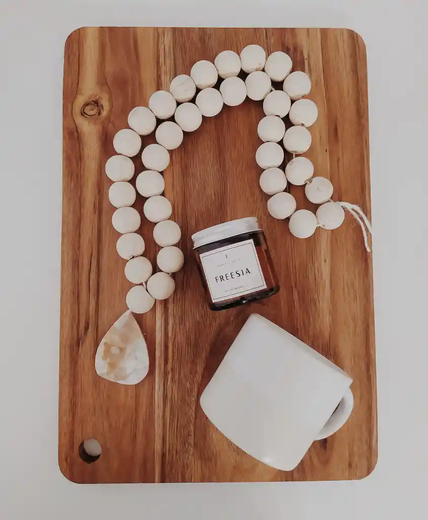 Un collar decorativo elaborado con sisal, cuentas de madera y concha marina, más una perfumada vela aromática de fresia y un hermoso tazón de diseño nórdico en colores pastel. Un lindo pack de regalo para quienes quieran calma y bienestar en sus espacios.