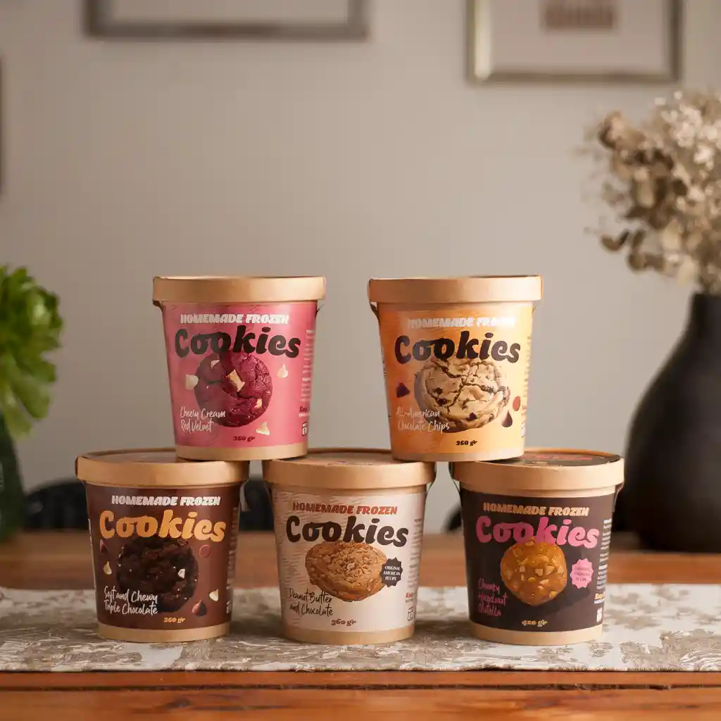 Todas nuestras 5 variedades de galletas juntas: All American Chocolate Chips, Cheesy Cream Red Velvet, Soft and Chewy Triple Chocolate, Peanut Butter and Chocolate y Chunky Hazelnut Nutella.