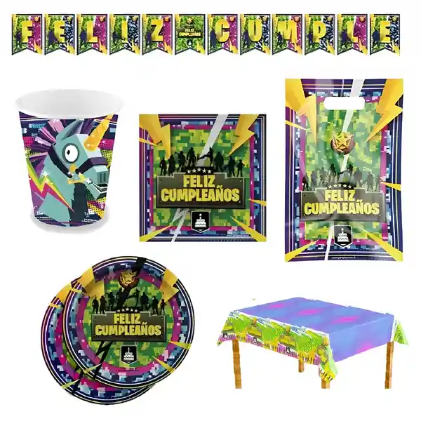 •1 Guirnalda FC •12 Platos •12 Bolsitas de Dulces •2 Mantel •12 Vasos •12 Servilletas