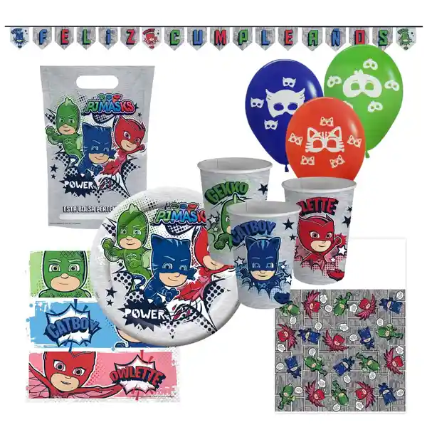 •18 Platos •3 Mantel •24 Servilletas •12 Globos PJ Mask •18 Bolsitas de Dulces •1 Guirnalda Feliz Cumpleaños •18 Vasos