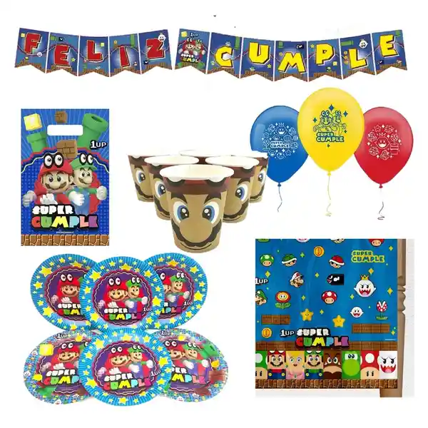 •30 Platos •30 Vasos •1 Guirnalda •5 Mantel •30 Bolsitas de Dulces •12 Globos