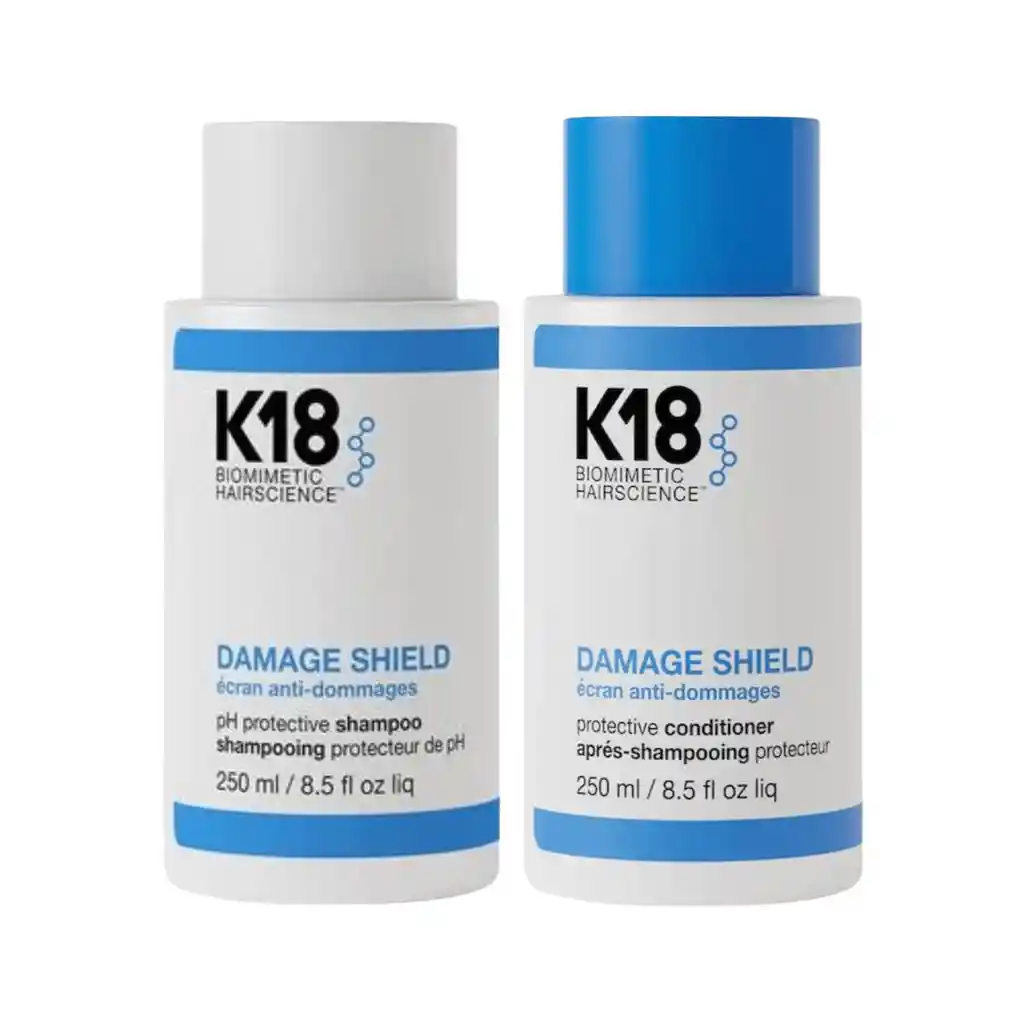Pack K18 Damage Shield Shampoo + Acondicionador Repara y protege tu cabello con el Pack K18 Damage Shield. El shampoo limpia profundamente mientras el acondicionador nutre e hidrata, reparando el daño a nivel molecular para restaurar la fuerza y elasticidad del cabello dañado.