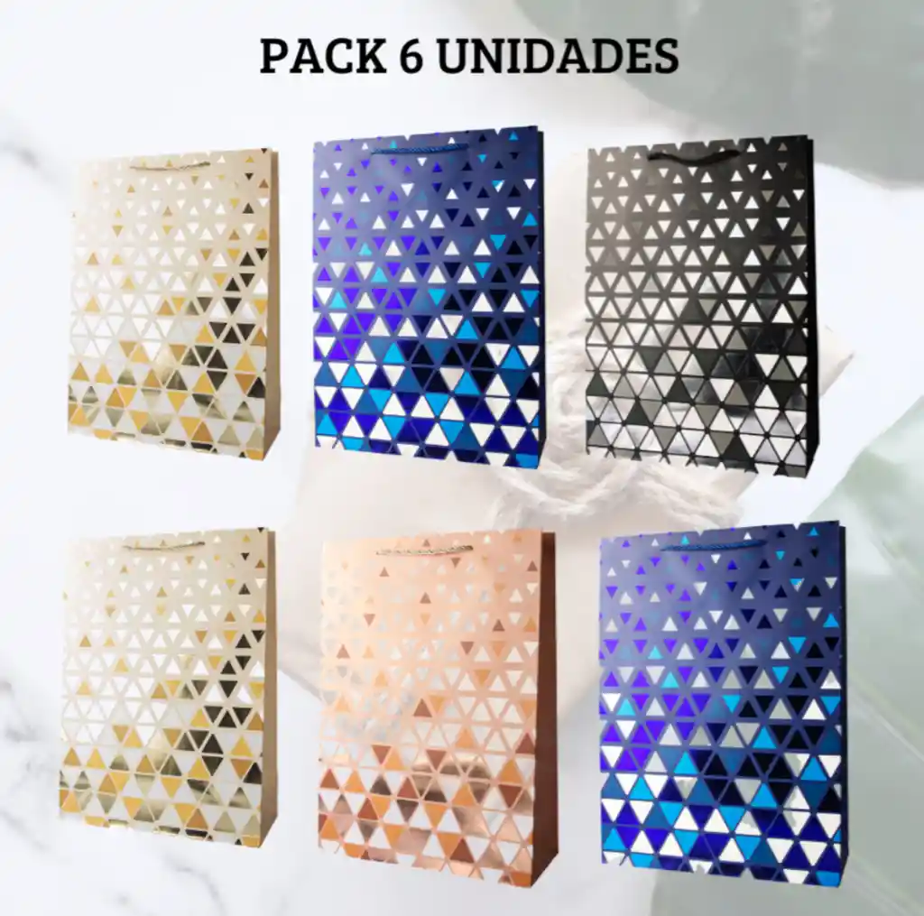 Bolsas de regalo mediana diseño geometrico disponibles en 3 modelos! Bolsa de regalo pequeña perfectas y ideales para regalar en cualquier momento! Pack de 6 unidades surtidas! SON SURTIDAS DE LO QUE HAY EN STOCK. NO SE PUEDEN ELEGIR COLORES SI DESEA PACK DE 6 UNIDADES. Medidas: Alto: 32cm Profundidad: 10.2cm Largo: 26cm