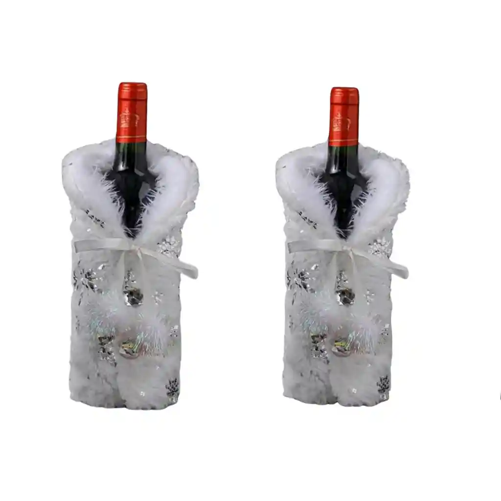 La decoración en época de navidad no estaría completa sin considerar estas cubiertas de botellas de Vino, pueden estar en tu mesa navideña como en tu mueble de licorero. El diseño es blanco en pelo corto con vivos plateados Características: - Material: Felpa - Tamaño: 27 cm de Alto, 15 cm de Ancho. Se vende en pack de 2 unidades del mismo diseño.