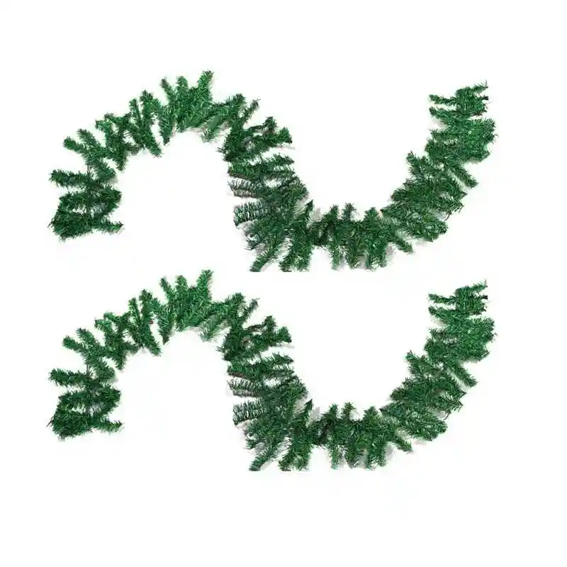 2 Guirnalda de pino artificial para Navidad. Largo total, 270 centímetros c/u. Ancho aproximado, 25 centímetros (totalmente abierta) y unos 20 centímetros al arreglarla. Color verde.