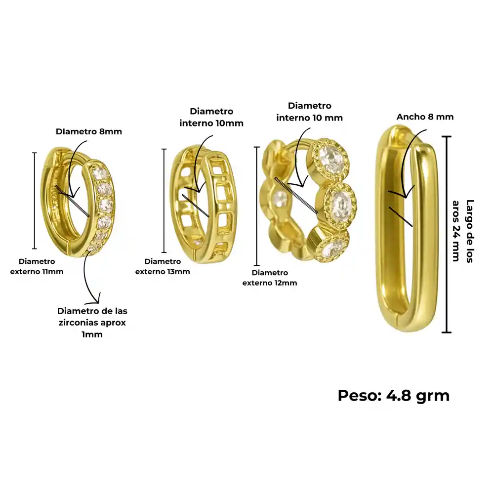 “Ella no compró un pack… compró el poder de diseñarse a sí misma.” No todas las mujeres se conforman con un solo par de aros. Algunas prefieren crear composiciones, jugar con alturas, texturas, brillos y significados. Para ellas, la oreja no es solo un lugar para colgar joyas… es un lienzo personal. Ella era una de esas mujeres. Y cuando encontró el Pack Gianna, sintió que por fin había encontrado piezas que respetaban su estilo. La primera argolla, una pieza pequeña de 11 mm externo, tenía un brillo delicado con zirconias de 1 mm que iluminaban el lóbulo sin exagerar. Luego, una argolla más amplia de 13 mm externo, estructurada, moderna, casi arquitectónica. Después, una argolla de diseño con zirconias grandes enmarcadas en detalles vintage, un equilibrio perfecto entre lo clásico y lo moderno. Y finalmente, una argolla rectangular de 24 mm de largo: minimalista, fuerte, elegante… la que terminaba de contar su historia. Cuatro diseños en oro 18K. Cuatro estilos diferentes. Un solo pack que le permitía crear, combinar y reinventarse cada día. Porque esto no es solo joyería. Es curación de oreja (ear curation). Es libertad. Es identidad. Es brillo pensado para mujeres con múltiples perforaciones que saben lo que quieren. 💎 Características del Pack Gianna Material: Chapada en oro 18K. Peso total: 4.8 g aprox. Incluye 4 diseños distintos: ⭐ Argolla 1 Diámetro externo: 11 mm Diámetro interno: 8 mm Zirconias de aprox. 1 mm ⭐ Argolla 2 Diámetro externo: 13 mm Diámetro interno: 10 mm Diseño estructurado y moderno ⭐ Argolla 3 Diámetro externo: 12 mm Diámetro interno: 10 mm Zirconias grandes tipo “brillante” ⭐ Argolla 4 Largo total: 24 mm Ancho: 8 mm Diseño rectangular minimalista Ideal para: Lóbulo Segundo y tercer lóbulo Helix Tragus Composiciones “ear curation” Estilo: elegante, moderno, versátil. 🌟 Beneficios para ti ✨ Perfecto para orejas con múltiples perforaciones. 💛 Todo lo que necesitas para crear diseños únicos. 💫 Chapado en oro 18k: más brillo, más durabilidad. 💎 Dos piezas con zirconias brillantes que equilibran elegancia y luz. 🪶 Livianos y cómodos: ideales para uso diario o de gala. 🎨 Editorial y moderno: piezas de diferentes estilos para personalizar al máximo.
