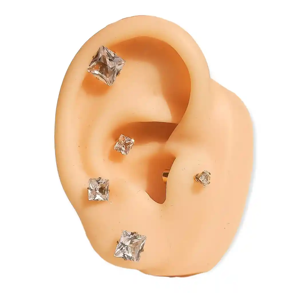 Bello pack o set de aros chapados en oro 18k. El pack consta de 5 pares de puntos de luz con bella zirconia cuadrada de 3, 4, 5, 6 y 7 mm, formando todas juntas una combinación perfecta para tu piercing de orejas en tendencia, como observas en las fotografias pueden ser usados en las siguientes perforaciones: Lobulo, lobulo superior, conch, tragus, anti-tragus, helix, flat, helix alto. Ah y lo mejor de todo los puntos de luz tienen tapitas de seguridad que no te lastimaran la parte trasera de tu orejita. Este es parte de nuestra colección de aros con bellas combinaciones que ni imaginas. Visita el resto de nuestros productos donde indica otras publicaciones del vendedor y encontraras todo lo que tenemos para ofrecerte. Metal: Chapadas en oro 18k Diámetros disponibles: 3 mm + 4 mm + 5 mm + 6 mm + 7 mm Peso aprox 6 g Se envía en bella presentación de regalo