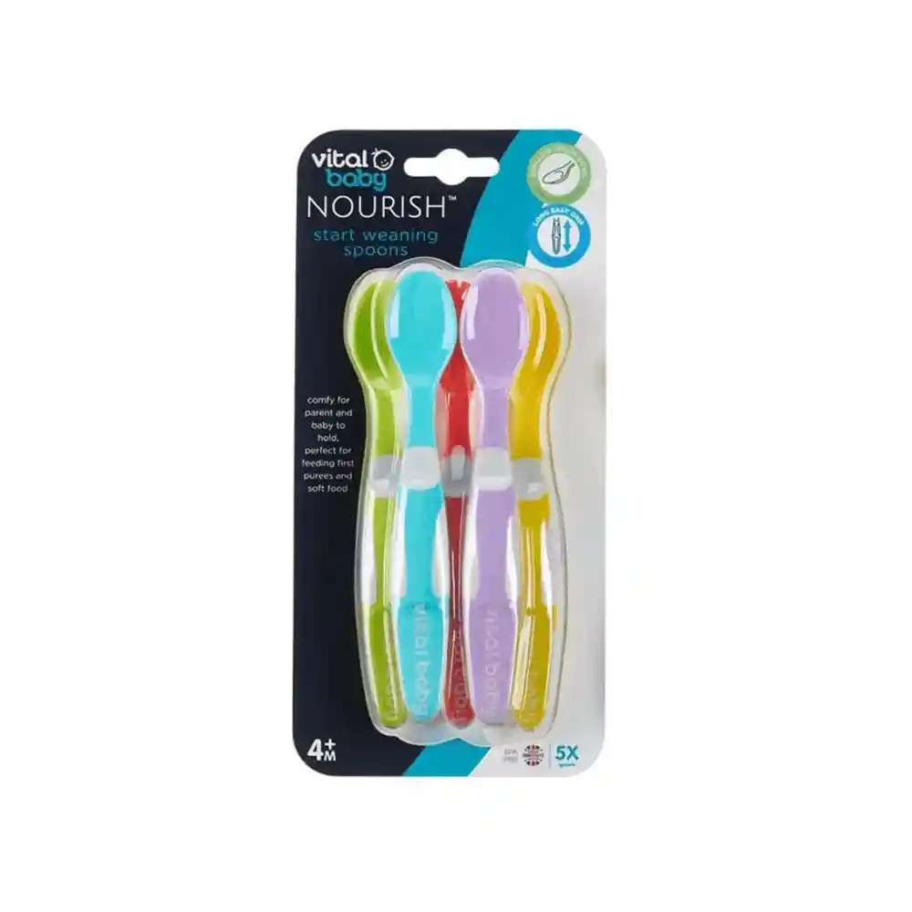 Blandas, Seguras y Libres de BPA Haz que la transición de la mamadera a la comida sólida sea más fácil y segura con el Pack de 5 Cucharas de Destete Vital Baby. Diseñadas especialmente para las primeras papillas, tienen puntas suaves y flexibles que cuidan las encías sensibles de tu guagua, evitando molestias mientras se acostumbra a nuevas texturas y sabores. Su tamaño es perfecto para las boquitas pequeñas y su mango ergonómico permite un agarre firme, tanto para los papás que alimentan como para los bebés que comienzan a experimentar con la autonomía. Además, vienen en colores llamativos que hacen del momento de comer una experiencia entretenida y estimulante. Con estas cucharas, cada comida se convierte en un paso más hacia la independencia de tu hijo, siempre con la seguridad y calidad que tu familia merece. Tips de uso Ideal para introducir las primeras papillas y comidas blandas desde los 4-6 meses. Lava las cucharas antes del primer uso con agua tibia y jabón neutro. Aptas para lavavajillas (bandeja superior). Usa siempre bajo la supervisión de un adulto. Combínalas con bowls y platos de la misma línea para un set completo. Especificaciones Material: Plástico libre de BPA, PVC y ftalatos. Incluye: 5 cucharas de destete. Edad recomendada: Desde los 4 meses en adelante. Características: Puntas blandas y flexibles, mangos largos y ergonómicos. Colores: Multicolor surtido. Certificaciones: Cumple con normativas de seguridad alimentaria internacionales (UE y FDA). Fabricante/Origen: Vital Baby, Reino Unido.