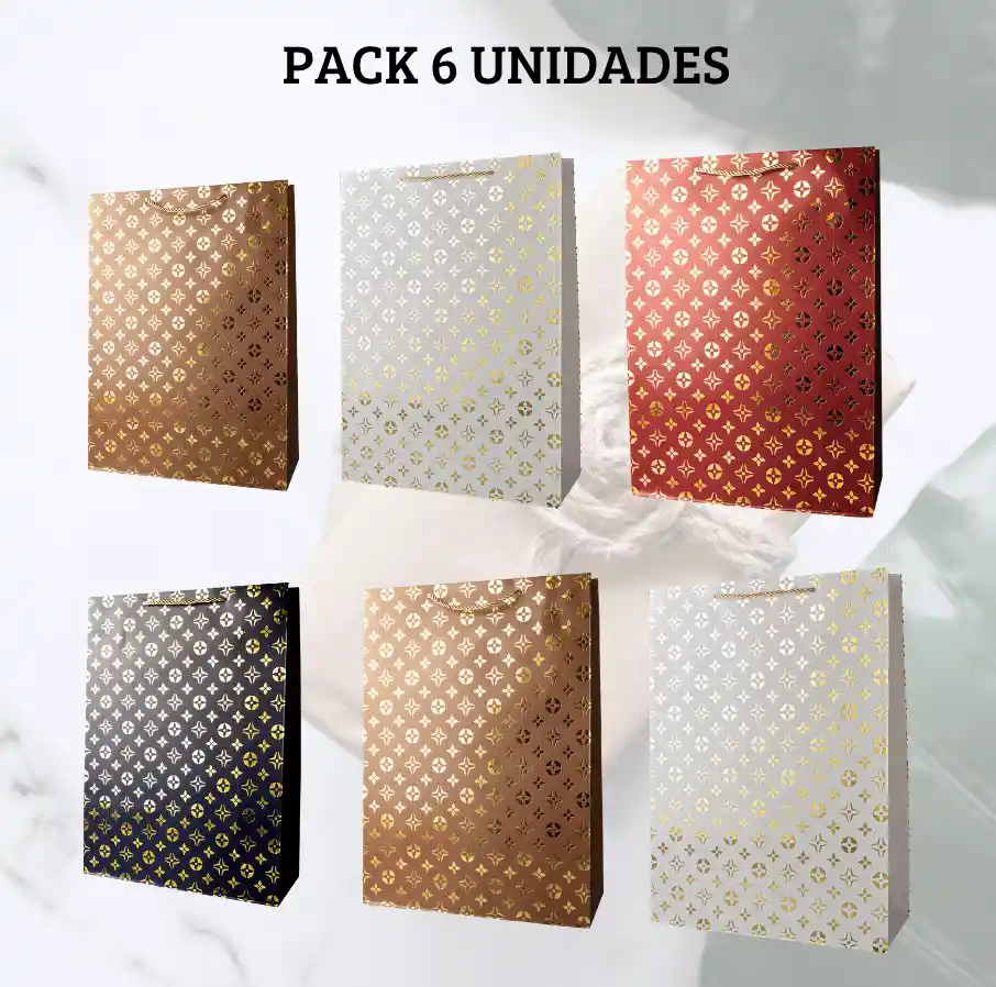 Bolsas de regalo grande diseño LV disponibles en 4 modelos! Bolsa de regalo pequeña perfectas y ideales para regalar en cualquier momento! SON SURTIDAS DE LO QUE HAY EN STOCK. NO SE PUEDEN ELEGIR COLORES SI DESEA PACK DE 6 UNIDADES. Medidas: Alto: 41.6cm Profundidad: 12.2cm Largo: 30cm