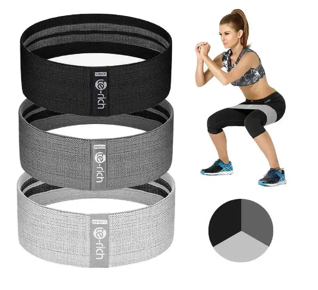 Las bandas elásticas conocidas como bandas glute, son ideales para trabajar y tonificar diferentes grupos musculares, con especial enfoque en los glúteos, caderas, piernas. Gracias a su liviano peso son fácilmente transportables, por lo que podrás usarlas donde quieras, ya sea en el gimnasio, en tu casa o llevarlas de viaje. Tres bandas de resistencia de tela para las piernas y el trasero. | Light: Banda de arranque perfecta, ideal para movimientos de postura anchos como sentadillas de sumo/pulmones. | Mediana: banda de progresión perfecta a medida que te haces más fuerte e ideal para empujes de cadera y refuerzos. | Pesado: perfecto para aquellos que quieren quemar calorias
