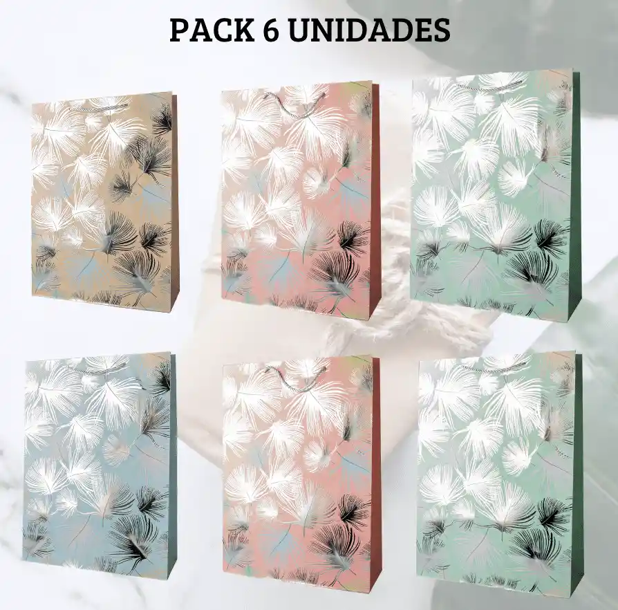 Bolsas de regalo grande diseño palmeras plateados disponibles en 4 modelos! Bolsa de regalo pequeña perfectas y ideales para regalar en cualquier momento! Puedes elegir una unidad o un Pack de 6 unidades surtidas! SON SURTIDAS DE LO QUE HAY EN STOCK. NO SE PUEDEN ELEGIR COLORES SI DESEA PACK DE 6 UNIDADES. Medidas: Alto: 41.6cm Profundidad: 12.2cm Largo: 30cm