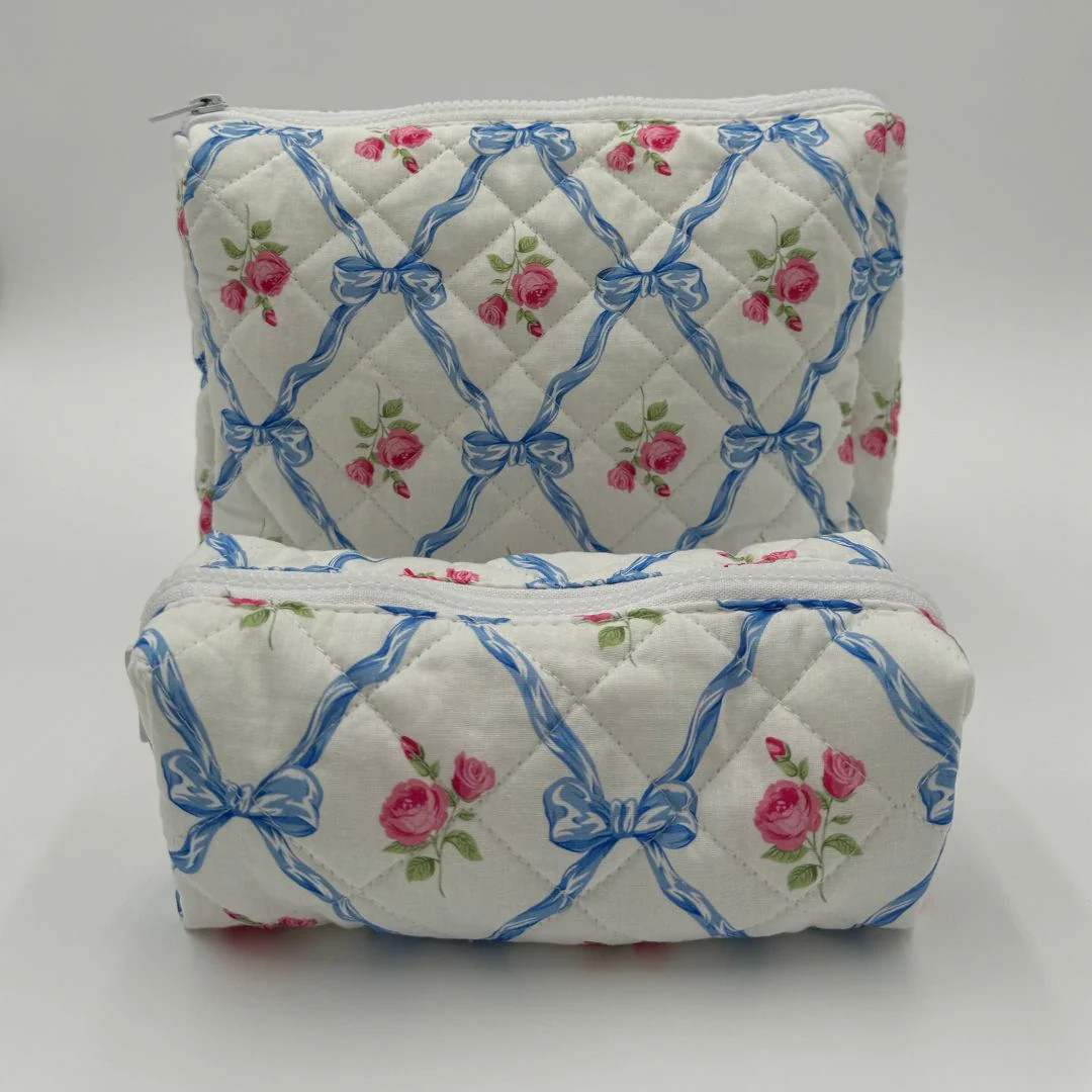 Pack de Regalo: Incluye dos cosmetiqueros con rosas azules. Uno grande especial productos del baño, cepillo, etc.. Y el segundo es como un estuche para brochas de maquillaje o lapices.