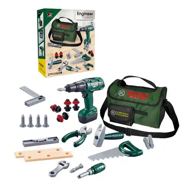 Pack Con 27 Unidades. ¡Ponte Manos a la Obra y Dale Rienda Suelta a tu Imaginación y Creatividad Con Este Fantástico Pack de Herramientas Con Bolso y Taladro! Los Pequeños Constructores de la Casa Podrán Reparar o Crear Casi Cualquier Cosa Que se Imaginen Llenas de un Toque de Diversión. Este Set Incluye 27 Piezas Que Todo Constructor Necesita Incluyendo un Taladro Que Funciona de Verdad y un Bolso Para Que Lleven Todos Sus Materiales a Donde Quiera Que lo Necesiten Diseñado Con Mejor Plástico no Tóxico Para Una Mayor Diversión y Durabilidad. Con Este Juguete Tus Pequeños Aprenderán a Conocer Los Fundamentos de la Comunicación y la Cooperación Fomentando la Confianza la Amistad y el Desarrollo Lingüístico. También Fomenta a Que Creen un Juego Imaginativo Promoviendo la Historia de Fantasía el Juego de Rol y la Creatividad. El Taladro Requiere de 2 Pilas AA no Incluidas.