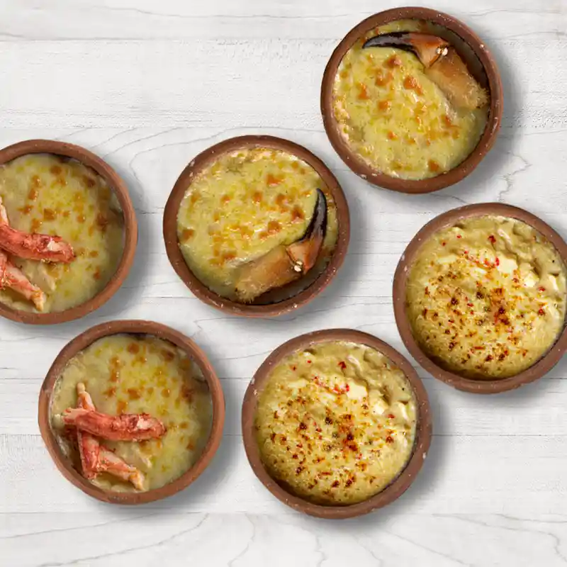 2 mini pasteles de Jaiba +2 mini chupe de Locos +2 mini pastel centolla Son 6 mini pasteles en pailas de greda. Puedes calentarlos en el horno hasta que estén hirviendo 5 minutos. Vienen congelados en una bandeja. Ideal para un picoteo