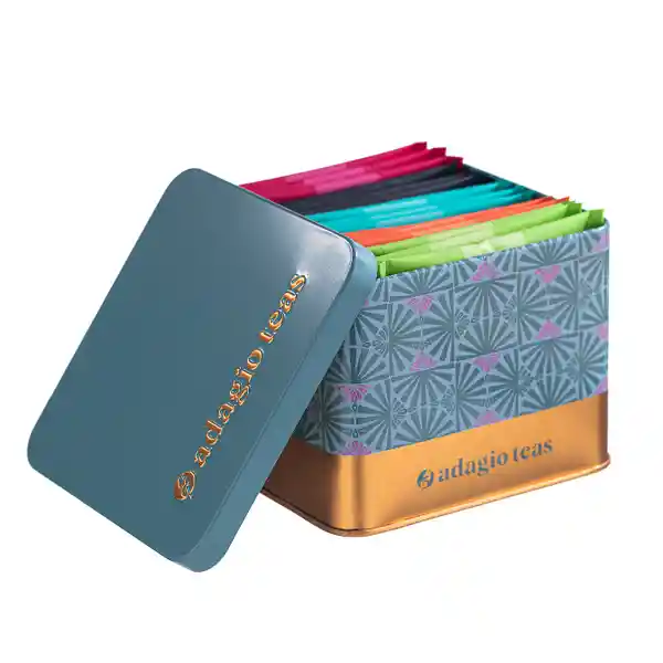 Pack Contiene 15 Unidades. Tus Tés Favoritos en Formato Teabag Ahora en Una Elegante Caja Metálica de Edición Limitada Perfecta Para Reutilizar. Esta Combinación de 5 de Los Sabores Más Populares de Adagio Teas te Dará la Frescura Ideal Para Disfrutar Este Verano.
