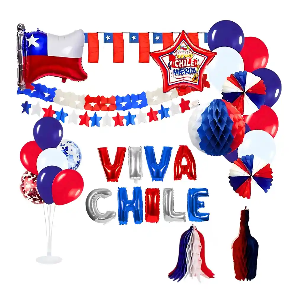 Pack de Decoración con productos en colores blanco, azul y rojo, para decorar Fiestas Patrias 1 Guirnalda bandera 1 Globo Bandera 1 Globo Viva Chile 3 Adorno Redondo 1 Globo Estrella 2 Guirnalda Tricolor 1 Set Globos y Pedestal 1 Set 25 Globos Tricolor 2 Adornos Chile