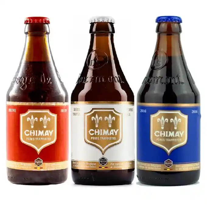 Pack degustación Chimay (Belgian Trappist) 3 variedades, cerveza de Bélgica elaborada por monjes en monasterios Trapistas con sello auténtico trapense. Incluye: - 1x Chimay Rouge (Belgian Dubbel) botella 330cc. - 1x Chimay Tripel (Belgian Tripel) botella 330cc. - 1x Chimay Bleue (Belgian Quadrupel) botella 330cc.