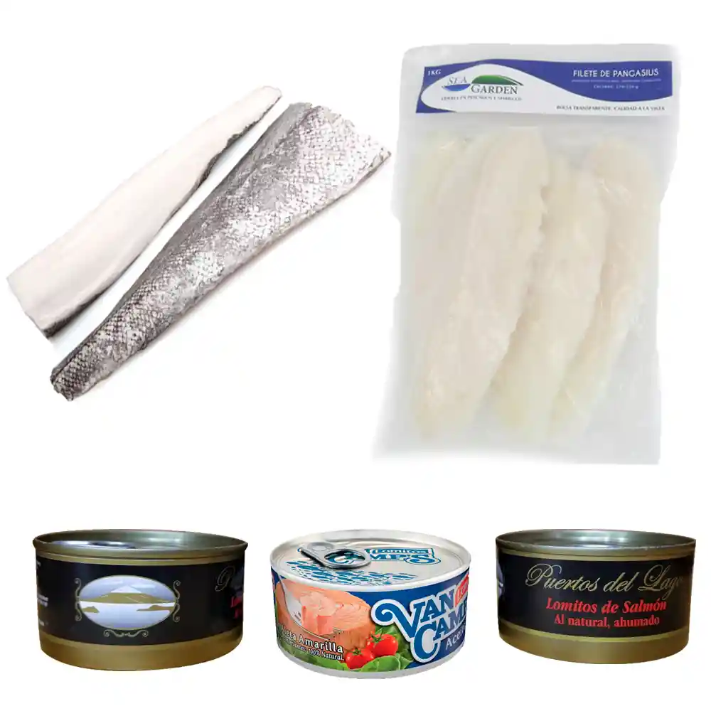 Pack para el papá: MERLUZA 1kgPANGASIUS 1kg1 Lata Atun Van Camps1 Salmón al natural en conserva (enlatado 190 grs)1 Salmon ahumado en conserva (enlatado 190 grs)