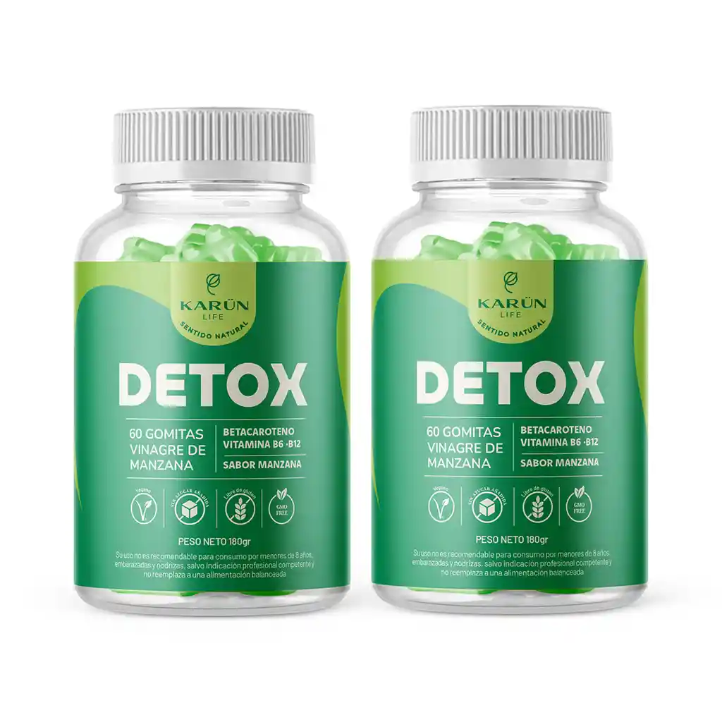 GOMITAS DETOX Karun Life con Vinagre de Manzana, Vitaminas B12 y B6, y Betacaroteno – 120 Unidades (2 Mes) Apoya tu bienestar general y regula tu azúcar de forma natural. Las GOMITAS DETOX son la opción ideal para quienes buscan mejorar su salud digestiva y controlar los niveles de azúcar en la sangre de manera natural. Con una fórmula vegana, sin azúcar y libre de gluten, cada gomita contiene ingredientes cuidadosamente seleccionados que ayudan a mantener un cuerpo sano y equilibrado. Ingredientes clave para un bienestar óptimo: Vinagre de Manzana: Ayuda a reducir los niveles de azúcar en la sangre y a eliminar bacterias intestinales, promoviendo un sistema digestivo saludable. Vitamina B12: Contribuye al buen funcionamiento del sistema nervioso, la producción de glóbulos rojos y mejora el estado de ánimo. Vitamina B6: Apoya la función neurológica normal y está involucrada en la producción de neurotransmisores esenciales para el bienestar emocional. Betacaroteno: Potente antioxidante que contribuye al mantenimiento de una piel sana y al fortalecimiento del sistema inmune. Beneficios destacados: Ayuda a reducir los niveles de azúcar en la sangre de forma natural. Apoya la función neurológica normal y la producción de glóbulos rojos. Actúa como un antibacteriano natural, eliminando bacterias intestinales. Libre de azúcar, gluten y 100% vegano, ideal para un estilo de vida saludable. Modo de uso: Consumir 2 gomitas al día junto con alguna comida por la tarde para disfrutar de sus beneficios y mejorar tu bienestar. ¿Por qué elegir GOMITAS DETOX Karun Life? Formuladas para un bienestar integral y un control natural del azúcar en la sangre. 60 gomitas por frasco (un mes de uso). Ingredientes naturales que apoyan tu salud digestiva y general. Este producto es un suplemento alimentario y no reemplaza una alimentación equilibrada. No es un medicamento y no previene, trata ni cura enfermedades. Ante cualquier duda, consulte con su médico tratante. No es recomendado para niños menores de 8 años ni para embarazadas