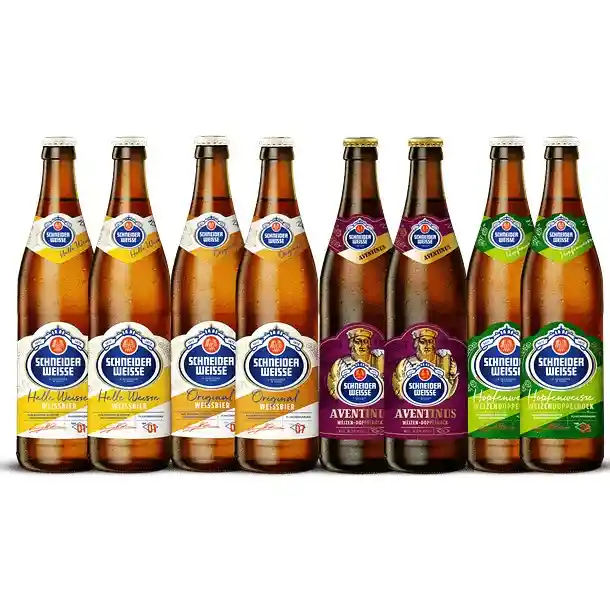 Una selección de las mejores cervezas de trigo (weissbier) producidas por Schneider Weisse, la más antigua y reconocida cervecería de Bavaria (sur de Alemania). Este pack incluye: Schneider Weisse TAP 1 Helles, botella 500cc x2 Schneider Weisse TAP 7 Original, botella 500cc x2 Schneider Weisse TAP 5 Hopfenweisse, botella 500cc x2 Schneider Weisse TAP 6 Aventinus, botella 500cc x2