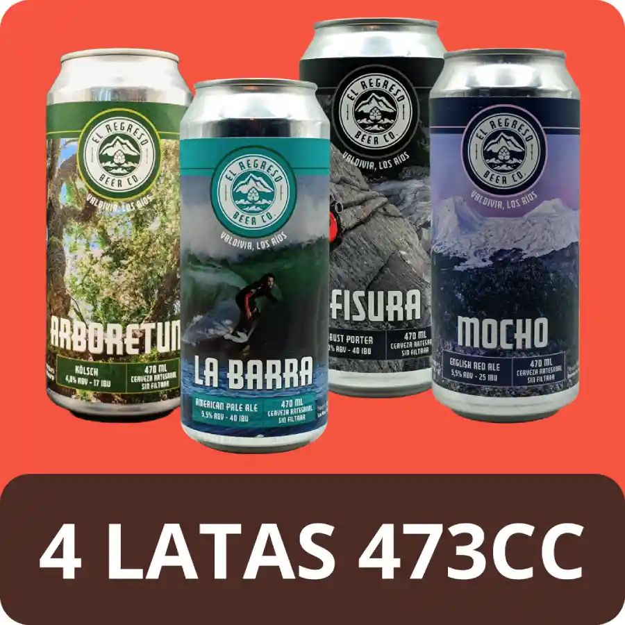 Este pack incluye: 1x El Regreso Arboretum 473cc Kölsch 1x El Regreso La Barra 473cc American Pale Ale 1x El Regreso Fisura 473cc Porter 1x El Regreso Mocho 473cc English Red Ale