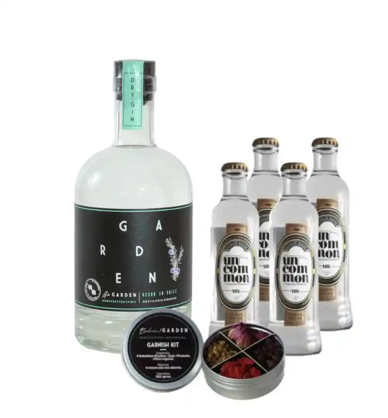 Pack Gin chileno Garden + 4x Agua tónica Uncommon Mixers 200cc + Garnish Kit Promoción - Gin Garden - 4 aguas tónicas Uncommon Mixers - Garnish kit con: Enebro • Goji • Pimienta • Rosa rugosa Equipa tu bar como corresponde y disfruta este espectacular gin chileno.