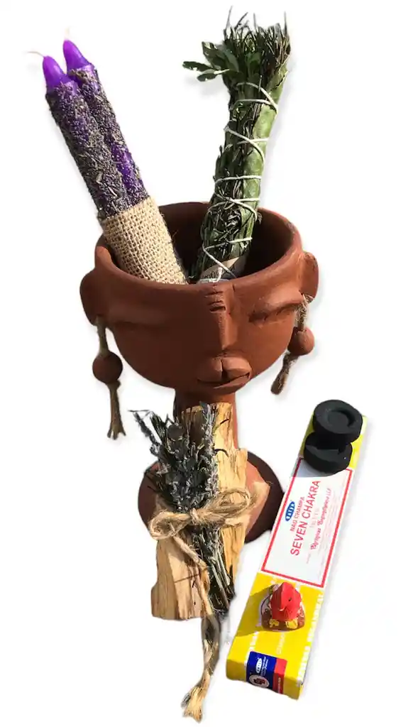 En el plano espiritual también puede aparecer la noción de transmutación. Ciertas religiones y creencias hablan de transmutación para referirse al cambio interno que experimenta una persona cuando se aleja de elementos dañinos (desde acciones hasta pensamientos). Es por ello que hemos creado un hermoso pack para que de alguna manera le ayude a que haga una limpieza profunda de las energías y vibraciones de su casa, oficina o lugar deseado o asimismo (Personal) Contiene: 1 Sahumador de Greda en forma de copa con colgantes en las orejas 18,5 x 11,5 cm 1 Ramo de sahumerio preparado especialmente para Limpieza energética (Ruda, Romero y Eucalipto) 3 Carbón para sahumador 2 Vela transmutación: Lila con semillas de amapola, romero y lavanda. 1 Cajita Incienso de 7 Chakras 1 Porta incienso Figurita Loro Rojo (Libertad) 1 palo santo para prender con 1 ramito de lavanda y romero MODELO UNICO SOLO 1 UNIDAD