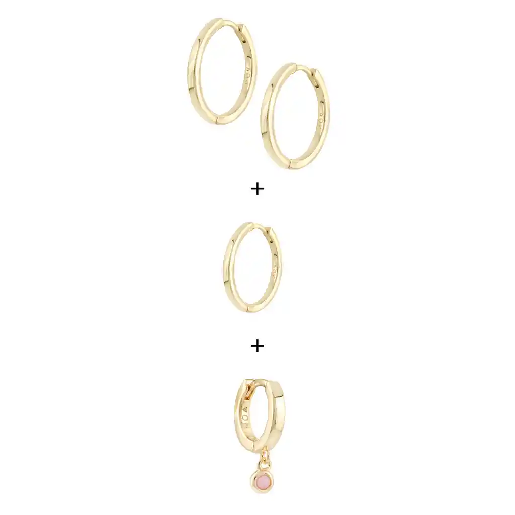 Este nuevo Pack Iris edición especial es un conjunto que incluye: 1 par de Argollas Mia 20mm, 1 unidad de argolla Mia 16mm y 1 unidad argolla Snow Pink 12mm. Material: Baño de oro de 14k, libre de níquel e hipoalergénico. Diámetro de los aros: 1 par de Argollas Mia 20mm, 1 unidad de argolla mia 16 mm y 1 unidad argolla Snow Pink 12mm