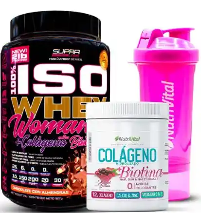 DescripciónNueva Proteína Iso Whey Woman + Colágeno Extra Biotina25g de proteína.6g de Aminoácidos ramificados (BCAAs).10g de Colágeno.150mg de Biotina.20mg de Zinc.Principales Características:0g Carbohidratos Netos.0g Grasas Trans.ENDULZADO CON ESTEVIA.LIBRE DE GLUTEN.AMIGABLE CON DIETAS KETO.BOVINO ALIMENTADO CON PASTO.LIBRE DE HORMONAS.LIBRE DE GMO.LIBRE DE PESTICIDAS.SIRVE PARAANTES DE ENTRENAR: Para darle energía a tu cuerpo.ENTRE COMIDAS: Como snack para reducir antojos.PARA COCINAR: Para preparar deliciosas recetas saludables.DESPUÉS DE ENTRENAR: Para ayudar a recuperar y reconstruir tus músculos.MODO DE USOLICUAR o MEZCLAR: Como complemento alimenticio, agregar 1 porción (1 medida contenida en el envase) de FAST NUTRITION - 100% ISO WHEY WOMAN a 190ml de agua, tapar y mezclar por 20 - 30 segundos.PARA RECETAS: Agregar y mezclar FAST NUTRITION - 100% ISO WHEY WOMAN a tu receta y luego batir, hornear o cocinar.Producto Keto amigableCOLAGENOEl colágeno es una proteína abundante en el cuerpo y es esencial para la integridad y estructura de la piel, huesos, tendones, ligamentos, cartílago y tejidos de soporte, contribuyendo a la movilidad y flexibilidad del cuerpo. Con el transcurso del tiempo el organismo disminuye su producción con lo que puede afectar a la salud.Colágeno + BCAA es una mezcla que aporta 12gr de colágeno hidrolizado y aminoácidos esenciales los cuales contribuyen a obtener una mejor recuperación muscular post entrenamiento, aumentar la síntesis de proteína y disminuir su degradación. Este alimento es una buena opción para quienes desean cuidar sus articulaciones, huesos, disminuir el estrés y fatiga muscular luego de realizar actividad física.El colágeno ayuda a reducir las arrugas, contribuye a la hidratación y elasticidad de la piel, estimula la producción de queratina en las uñas y cabello para evitar la falta de crecimiento. Eso proporciona una piel más firme, suave y radiante.El colágeno contribuye a la regeneración de los tejidos de la piel sana y construye nuevas células de la piel. Un colágeno hidrolizado es más fácil de digerir y se absorbe más rápido que una proteína no hidrolizada.12gr de colágeno hidrolizado.Libre de gluten.Libre de lactosa.Sin azúcar.Sin colorantesRico sabor.Disolución rápida.Ingredientes: Colágeno hidrolizado, isoleucina, leucina, valina, maltodextrina, ácido cítrico, citrato de sodio, saborizante idéntico a natural, fosfato dipotásico, sucralosa, acesulfamo de potássio, fosfato tricálcico.