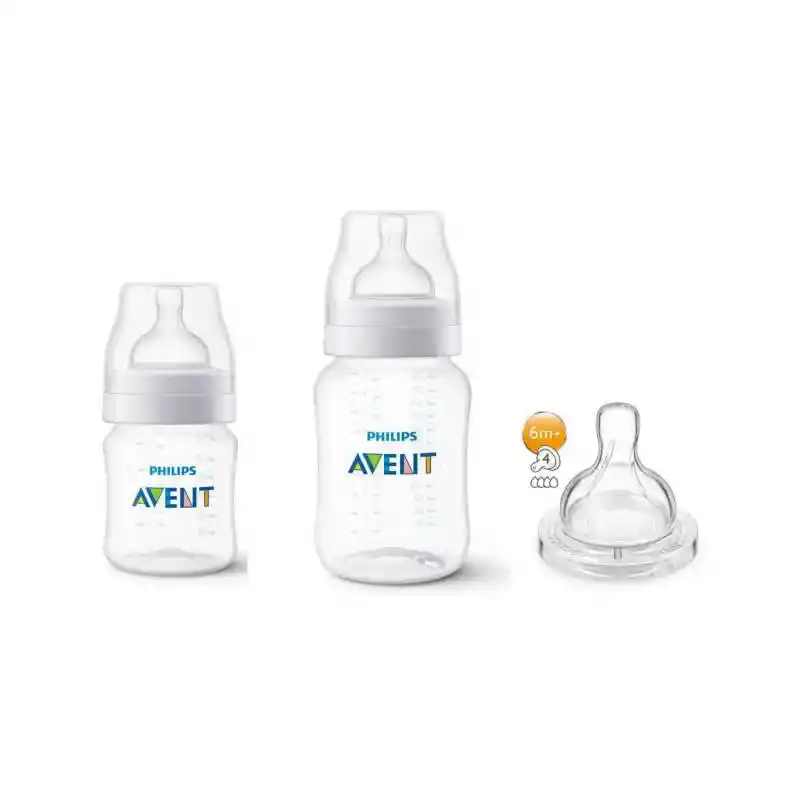 Contenido: 2 Mamaderas Anticolicos de 125 ml y 260 ml 1 Tetina de 6 meses+ Mamaderas Anticólicos 125ml - 260ml Características: Menos cólicos: Nuestra válvula anticólicos se ha diseñado para evitar que el aire entre en la barriguita del bebé y reducir los gases y las molestias. Cuando el bebé se alimenta, la válvula integrada en la tetina se flexiona con el fin de que el aire entre en el biberón para evitar la acumulación de vacío, y dirige el aire hacia la parte posterior del biberón. El aire se mantiene en el biberón, alejado del estómago del bebé, para reducir los cólicos y las molestias Menos malestar: El biberón anticólicos Philips Avent reduce el malestar. Los bebés alimentados con biberones anticólicos Philips Avent experimentaron un 60 % menos de malestar por la noche, en comparación con los bebés alimentados con un biberón anticólicos de la competencia.* Alimentación ininterrumpida: La forma de la tetina permite un enganche seguro y la textura acanalada ayuda a evitar que la tetina se colapse para disfrutar de una alimentación cómoda e ininterrumpida Enganche seguro: Tetina diseñada para un enganche seguro Fácil de montar: Nuestro biberón anticólicos tiene pocas piezas para montarlo de forma rápida y sencilla Fácil de agarrar: La exclusiva forma del biberón permite sujetarlo fácilmente en cualquier dirección. Fácil de limpiar: Con su cuello ancho y menos piezas, nuestro biberón es más fácil de montar y limpiar por completo y con rapidez Diseño antigoteo: Nuestro biberón anticólicos se ha diseñado para evitar el goteo durante la alimentación, para disfrutar de una experiencia realmente agradable. Creciendo con su bebé: Combine las piezas de nuestros extractores de leche, biberones y vasos, y cree el producto ideal para usted, cuando lo necesite. El biberón anticólicos Philips Avent está fabricado con material sin BPA (PP). Capacidad: 125 ml -260 ml Edad recomendad: 0 meses + - 1 Meses + Incluye tetina flujo medio, lento Fácil de combinar con la lactancia materna natural Nuestra suave tetina estriada evita la contracción de esta y está diseñada para bebés. La comodidad de los pétalos y la forma natural de la tetina permiten un enganche natural y facilitan la combinación de la lactancia materna y la alimentación con mamadera. Ajuste natural gracias a la tetina más ancha con forma de pecho La tetina ancha con forma de pecho permite un ajuste natural, parecido al del pecho, lo que le permite al bebé combinar la lactancia materna y la alimentación con mamadera. Un diseño de tetina flexible y estriada que evita la contracción de esta Los pétalos y las rugosidades del interior de la tetina permiten una mayor flexibilidad sin que se contraiga para brindar una alimentación ininterrumpida. Válvula anticólicos diseñada para reducir la incomodidad y los cólicos La válvula anticólicos se diseñó para expulsar el aire de la pancita del bebé y para ayudar a reducir la incomodidad y los cólicos. Libre de BPA