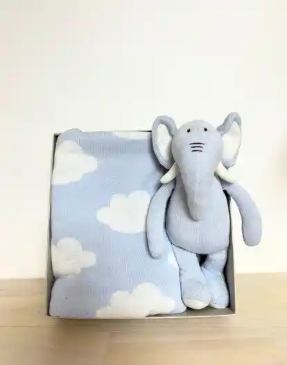 Esta manta es 100% algodón de extra calidad. Es muy suave al tacto. Puedes usarla en cualquier temporada. Es perfecta para la piel de tu bebé. Su diseño son nubes de color blanco con fondo celeste y su parte posterior, alterna los colores. Incluye un adorable peluche tejido de elefante celeste, para darle todo el amor y compañía a tu pequeño.