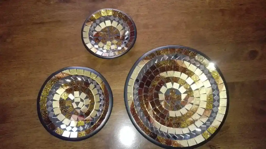 Set de 3 hermosos platos mezcla de 3 cafes y negro y espejos Grande 43 x 9 cm Mediano 36 x 8,7 cm Chico 27 x 6,2 cm Ideal para exterior o interior Modelo único por unidad