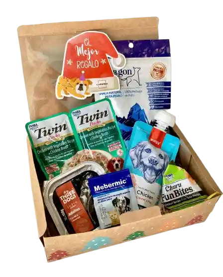 Super pack navideño para tu mascota, ¡Perfecto para regalonearlo estas fiestas como un miembro más de tu familia! en cada cajita encontrarás nuestra super selección de premios , alimento húmedo y antiparasitario, ideado para ser un regalo más bajo el arbol de navidad. Contenido Variado de: - 1 Sobre patagon row sabor "pollo" o "pavo", 100gr - 1 Twin Pack sabor "pollo con vegetales y salsa" o "pollo con vegetales y ternera con salsa". - 1 Wanpy tasty sabor "pollo", o "salmón", o "pato", o "ternera". - 1 Lata alimento humedo three dogs sabor "adulto carne con zanahoria ", o "pollo light", o "pollo +7". - 1 Sobre individual Churu fun bites sabor "pollo con atún". - 1 Sobre "mebermic", antipareasitario interno de amplio espectro, 1 comprimido para 10 kg de peso