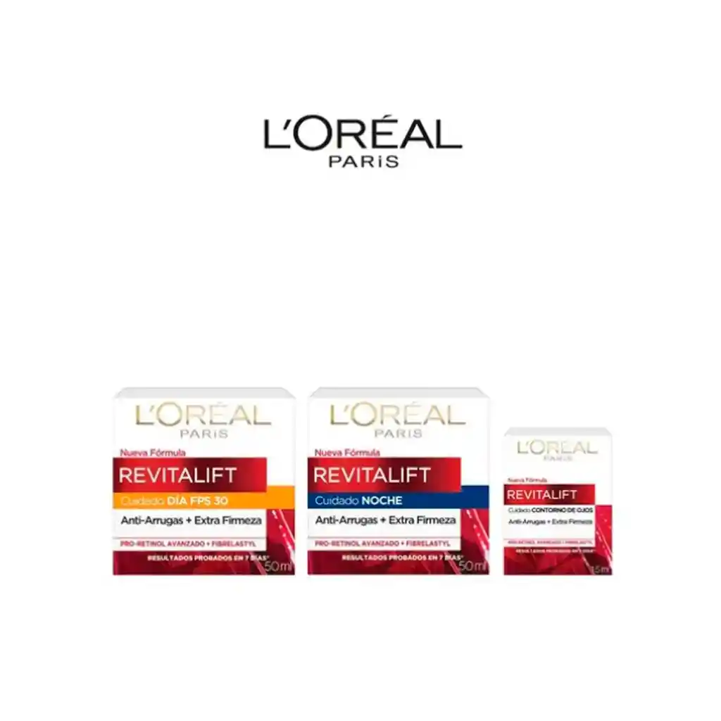 1 Crema De Día Anti-Arrugas + Firmeza Revitalift 50 Ml 1 Crema De Noche Anti-Arrugas + Firmeza Revitalift 50 Ml L'Oréal 1 Contorno De Ojos Anti-Arrugas Revitalift 15 Ml L'Oréal La crema de día Revitalift de L´Oreal Paris ha sido elaborada con Elasti-flex y Pro-retinola para una piel más elástica y firme. Al ser elaborada con estos poderosos ingredientes, lucirás una piel más densa, elástica, firme y será estimulada para una reconstrucción cutánea. Utilizar todas las mañanas sobre rostro y cuello perfectamente limpios, con movimientos circulares para una mejor penetración del producto en la piel. Evita el contacto con los ojos. La crema de noche Revitalift de L´Oreal Paris ha sido elaborada con Elasti-flex y Pro-retinola para una piel más elástica y firme. Al ser elaborada con estos poderosos ingredientes, lucirás una piel más densa, elástica, firme y será estimulada para una reconstrucción cutánea. Utilizar todas las noches sobre rostro y cuello perfectamente limpios, con movimientos circulares para una mejor penetración del producto en la piel. Evita el contacto con los ojos. La crema contorno de ojos de Revitalift de L´Oreal Paris ha sido elaborada con Elasti-flex y Pro-retinola para una piel más elástica y firme. Al ser elaborada con estos poderosos ingredientes, lucirás una piel más densa, elástica, firme y será estimulada para una reconstrucción cutánea. Aplicar todas las mañanas/noches sobre el contorno del ojo, con movimientos circulares para una mejor penetración del producto en la piel. Evita el contacto con los ojos.