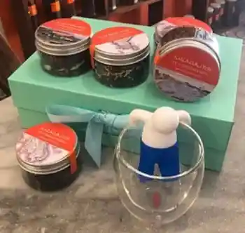 Pack tazón térmico de doble vidrio, infusor de silicona, además de 5 latas de diferentes variedes de té e infusiones. Todo envuelto en caja con papel seda y cerrado con broche de cinta