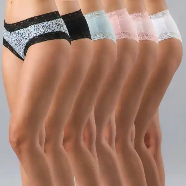 Pack Flores Contiene 6 Unidades. Pantaleta Algodón Blonda Color Mix Talla L 95% Algodón y 5% Elastano.