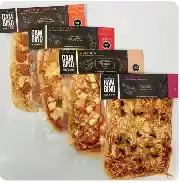 Selección de nuestras pizzas congeladas para lucirte en la parrilla - 1 Giovanella - 1 Collo Sardo (Prosciutto, Queso de cabra, ajo chilote tostado - 1 Pepperoni (Pepperoni, Aceitunas negras, Orégano) - 1 Fungazza (Champiñon, Cebolla morada, Aceitunas verdes) - 25x35 aprox. cada una. Comen 2 a 3 personas por pizza Instrucciones de preparación Pre calienta el horno 10 minutos al máximo con la lata adentro. Pon tu pizza directamente congelada, espera de 8 a 10 minutos y a disfrutar! Comen 2 a 3 personas